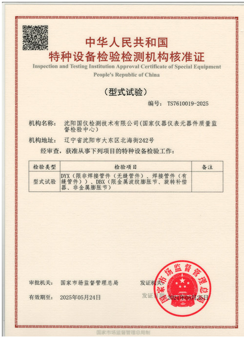 經(jīng)國(guó)家市場(chǎng)監(jiān)督管理總局審查,獲準(zhǔn)從事DYX(限非焊接管件(無(wú)縫管件)、焊接管件(有縫管件))、DBX(限金屬波紋膨脹節(jié)、旋轉(zhuǎn)補(bǔ)償器、非金屬膨脹節(jié))特種設(shè)備型式試驗(yàn)檢驗(yàn)工作。